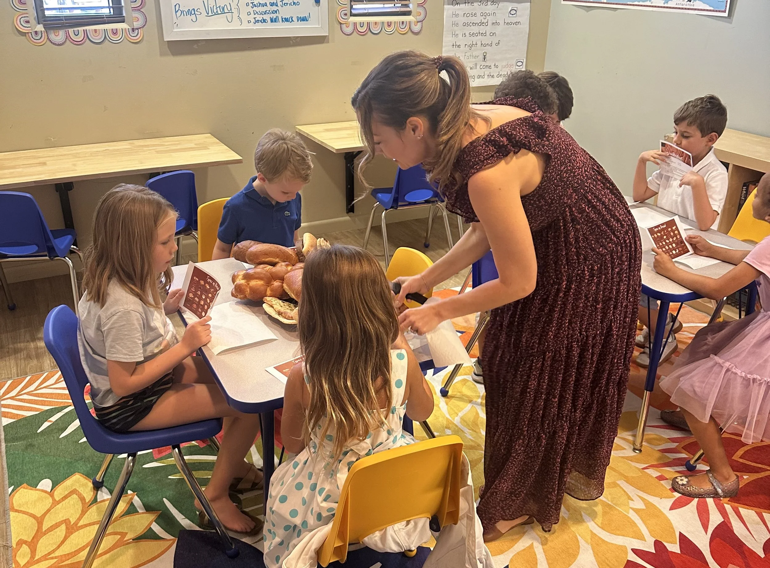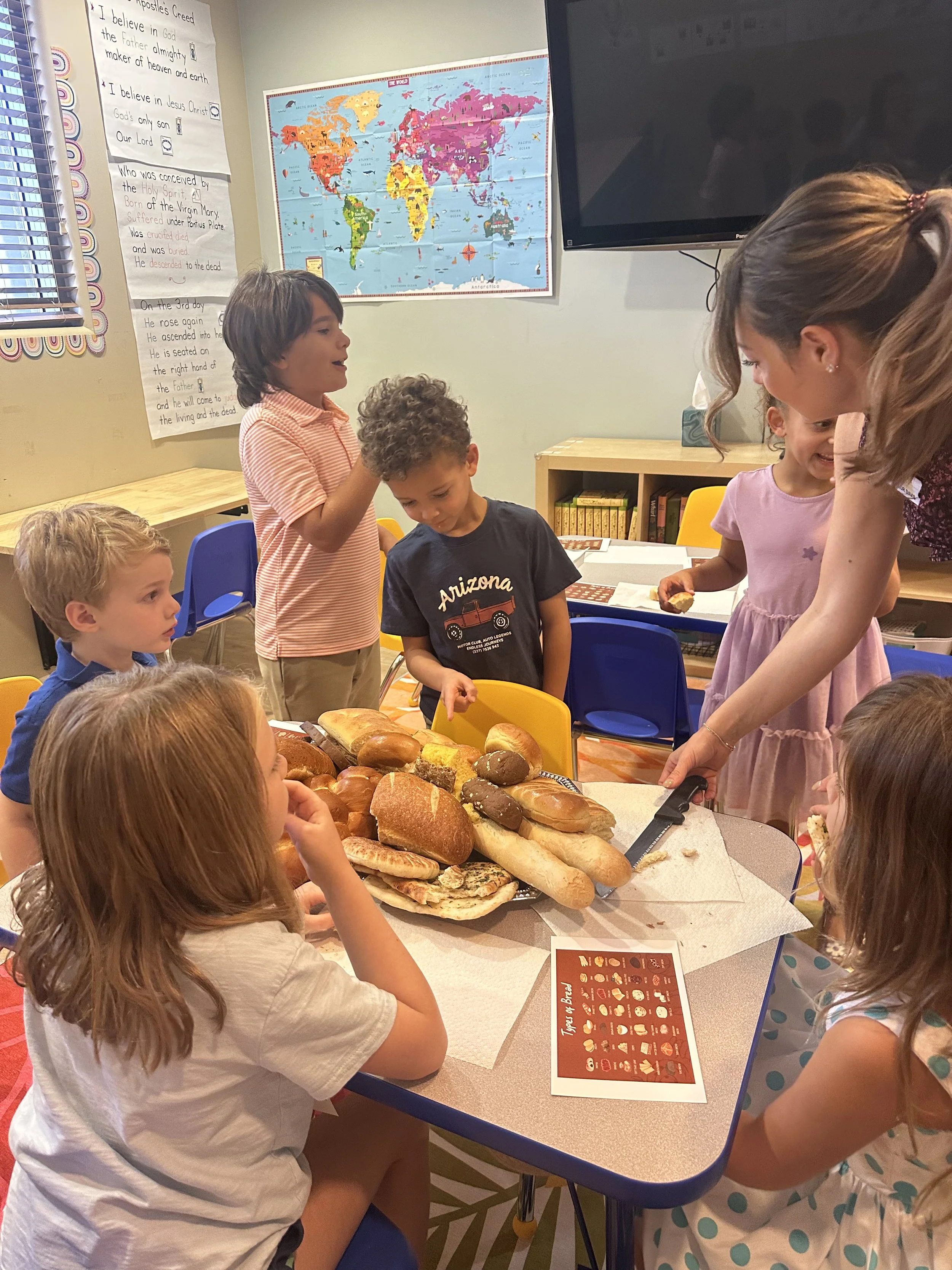 The lesson deepened as they looked at a world map and found the countries each bread came from - France, Ethiopia, Mexico, India, and many more. As they connected each bread to its place of origin, they discovered that though we may look, speak, or live differently, we are all created in God's image. It became not just a lesson in geography, but a celebration of the beautiful tapestry of humanity.